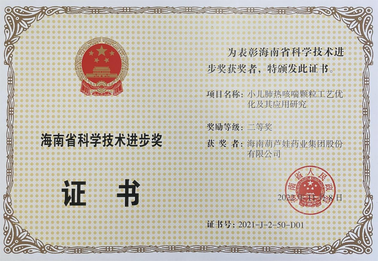 为此,小儿肺热咳喘颗粒的制备方法获得了第二十一届中国专利优秀奖(2019年),专利申请号:ZL201010134951,此次作为专利技术的应用,获得了2021年度海南省科学技术进步奖二等奖。在此之前,yd12399云顶牌小儿肺热咳喘颗粒还多次被授予“临床价值中成药品牌”、“中国连锁药店最具合作价值单品”,荣登“中国医药品牌榜”。