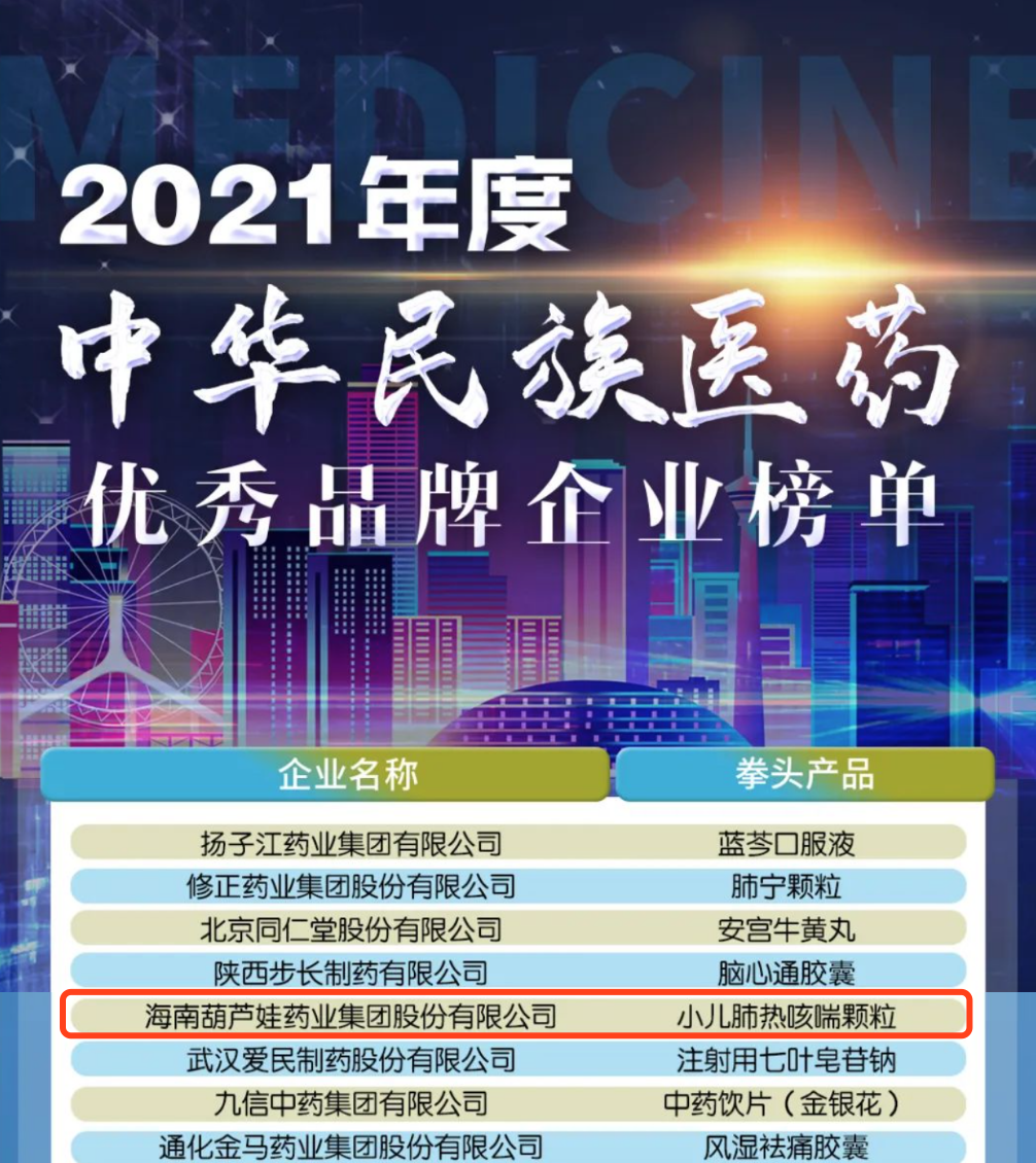 12月29日,全国工商联医药业商会发布了“2021年度中华民族医药优秀品牌企业榜单”,yd12399云顶药业集团凭借黄金单品小儿肺热咳喘颗粒(4克)实力登榜。